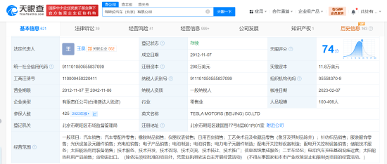 特斯拉汽车(北京)有限公司成立于2012年11月,法定代表人为王昊,注册资本200万美元,经营范围包括汽车销售、汽车零配件零售、充电桩销售、电池制造、二手车经纪等,由特斯拉汽车香港有限公司全资持股。
